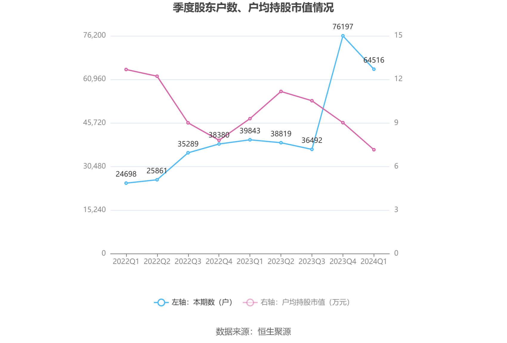 筹码集中度方面,截至2024年一季度末,公司股东总户数为6.45万户,较上年末下降了1.17万户,降幅15.33%;户均持股市值由上年末的9.02万元下降至7.16万元,降幅为20.62%。