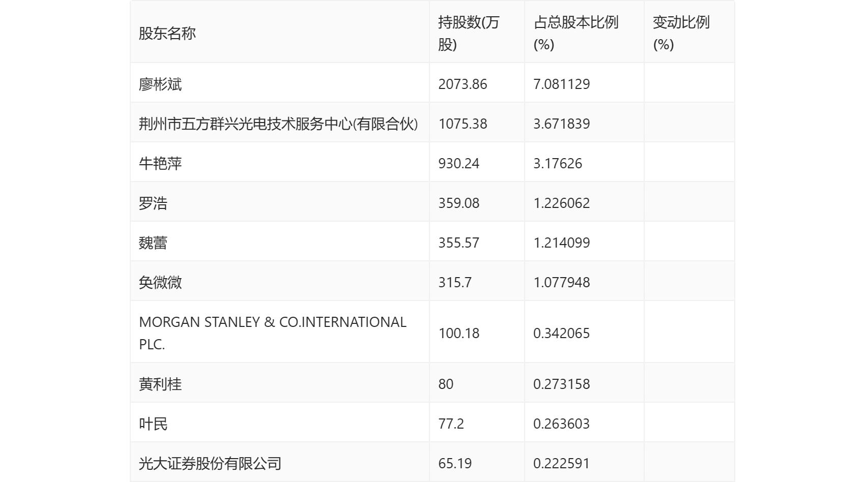 一季报显示,2024年一季度末公司十大流通股东中,新进股东为MORGAN STANLEY & CO.INTERNATIONAL PLC.、叶民、光大证券股份有限公司,取代了上年末的协捷物华天宝私募证券投资基金、方毓亮、汐合AI策略1号私募证券投资基金。在具体持股比例上,廖彬斌、荆州市五方群兴光电技术服务中心(有限合伙)、罗浩、魏蕾、奂微微、黄利桂持股有所上升,牛艳萍持股有所下降。