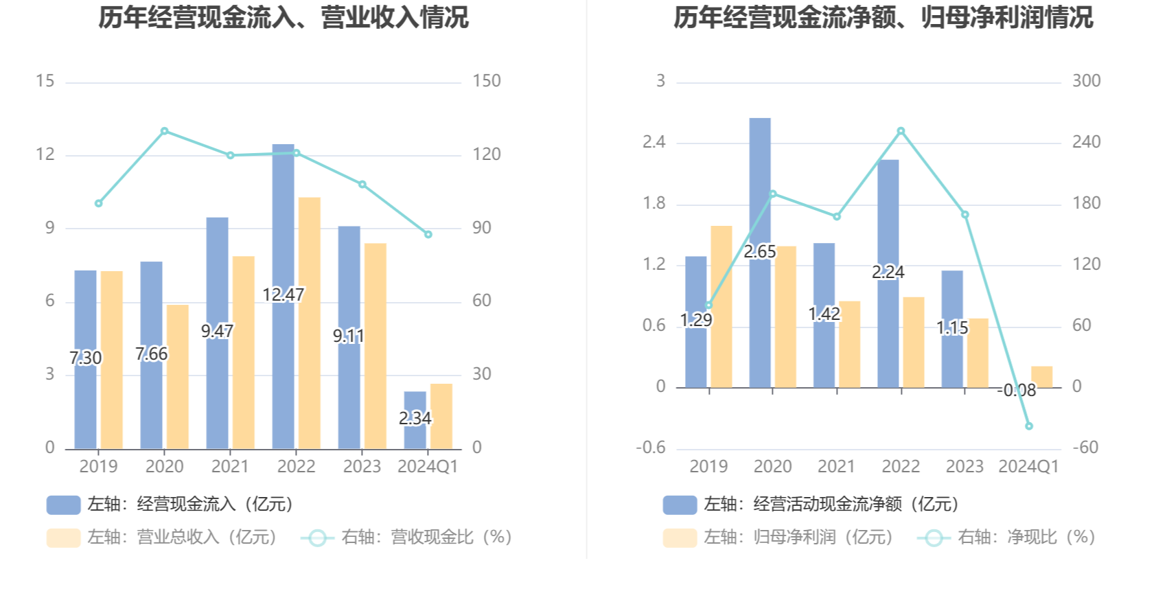 2024年第一季度,公司营业收入现金比为87.73%,净现比为-37.78%。