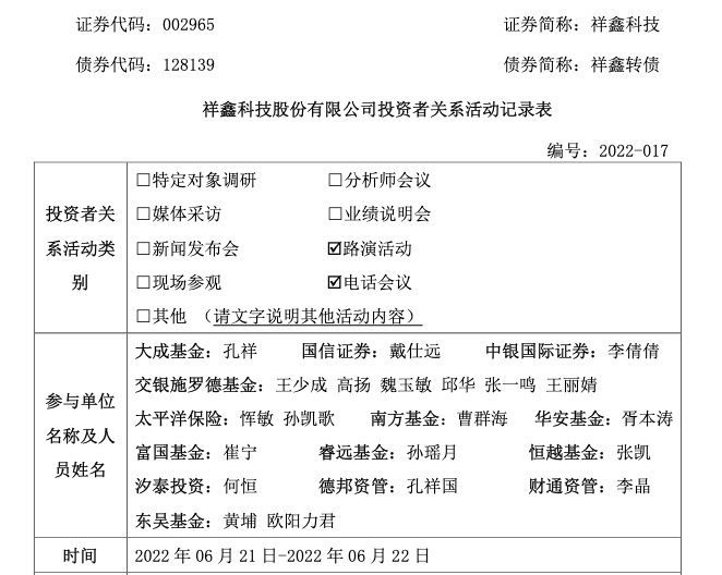 在调研中,针对投资者关于公司在CTB技术和CTP3.0技术上有什么布局时,祥鑫科技答复称,公司与客户在CTP3.0技术和CTB技术上已经建立了共同开发的意向。同时,还有投资者提问,公司在水冷板方面有哪些技术储备?公司表示,在动力电池领域,公司能够根据客户需求提供各种电池箱体解决方案。目前公司供应的新能源汽车动力电池产品包括了箱体上盖、托盘、端板、液冷板、底护板等金属结构,并与华南理工大学共建的“新能源汽车动力电池系统联合研究中心”进行了包括但不限于电动汽车电池箱体产品结构设计、电池PACK结构件开发、电池热管理系统的开发,在共同研发过程中掌握了丰富的经验。