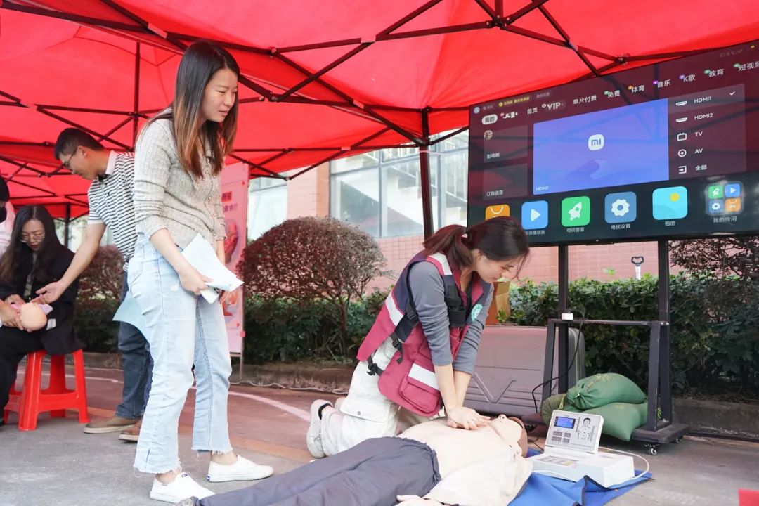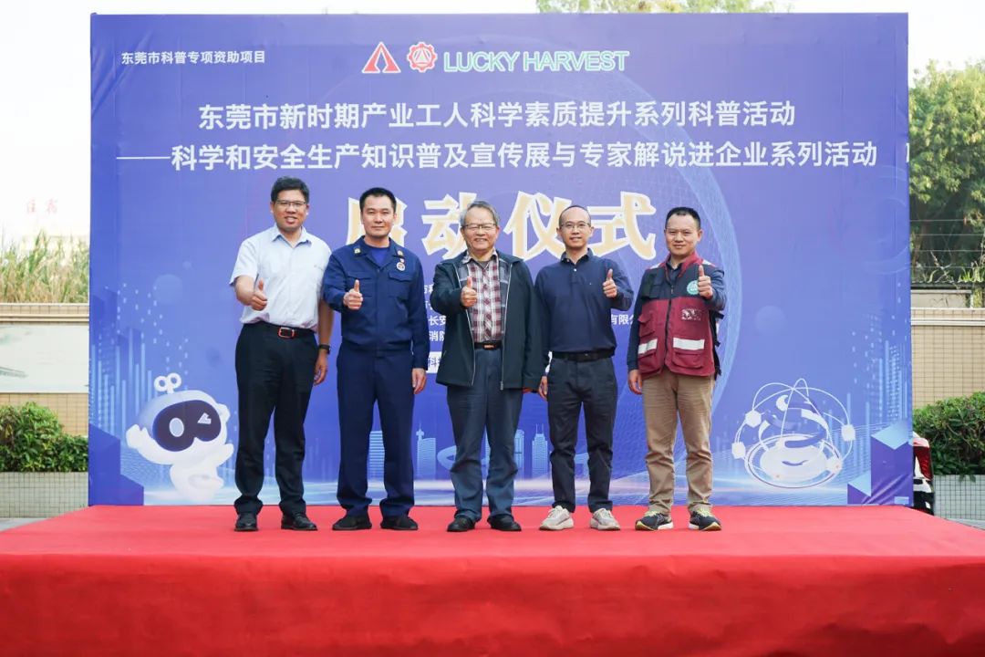 随后,刘院士、李局、林副队长、彭站长、郭总共同启动了东莞市新时期产业工人科学素质提升系列科普活动。启动仪式后,现场气氛达到高潮,各部门人员踊跃参与到心肺复苏、气道异物梗阻急救、VR 体验、军事科技展览等各类科普项目中,亲身体验科学的魅力与力量。