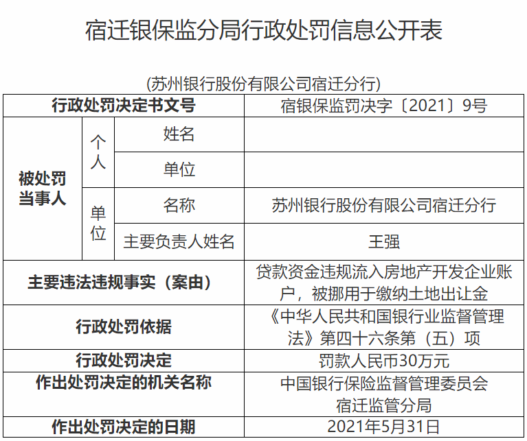 6月8日,银保监会宿迁银保监分局公布了一张罚单,苏州银行宿迁分行因贷款资金违规流入房地产开发企业账户,被挪用于缴纳土地出让金,被罚款30万元。