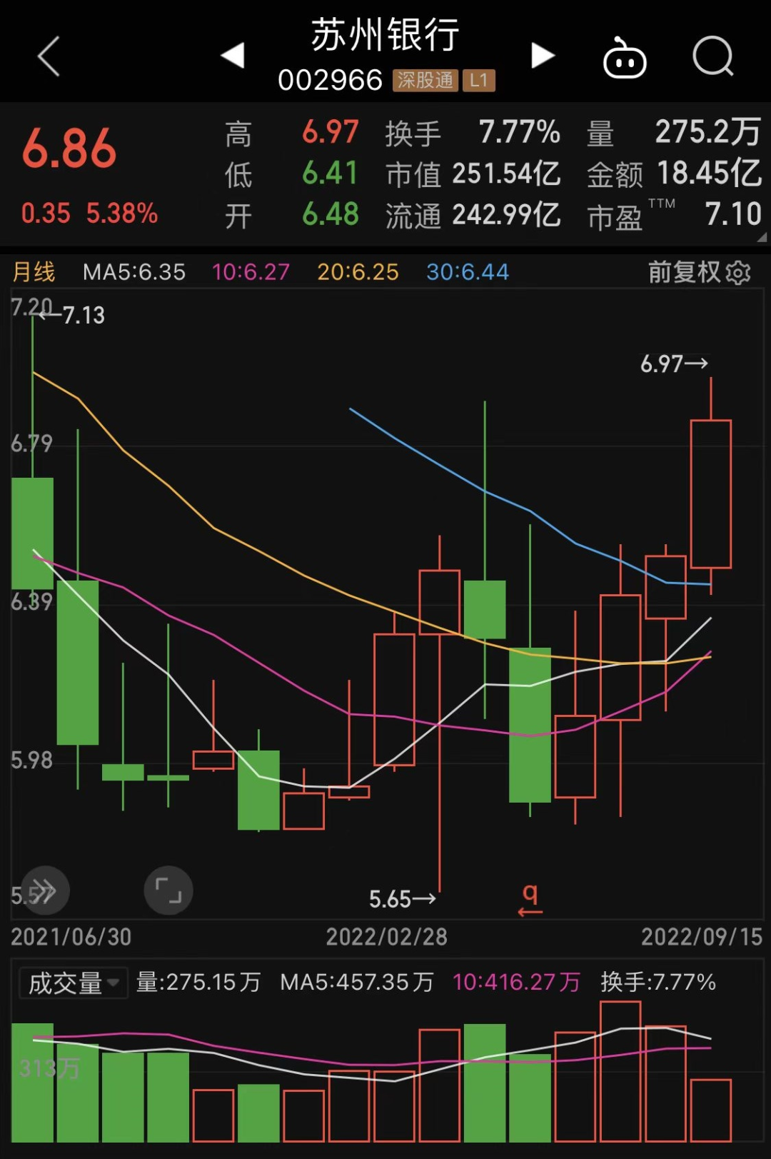 上述公告发布后,市场反响颇为积极。9月15日,苏州银行股票放量上涨,股价一度逼近7元/股关口,并创下自2021年6月21日以来的新高,这也让前期增持的苏州银行管理层收益颇丰。