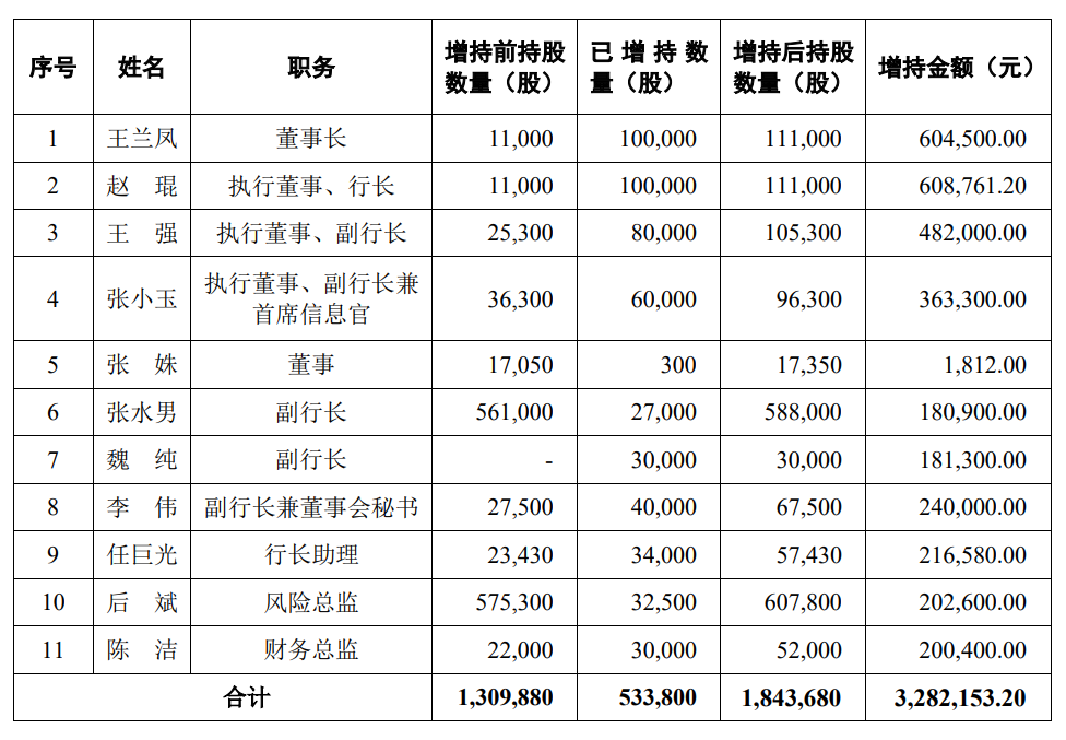 根据稳定股价方案,增持主体包括董事长王兰凤、行长赵琨在内的11名董事、高管,增持金额合计不低于205.91万元。此后,相关人员即紧锣密鼓开始择机实施增持。