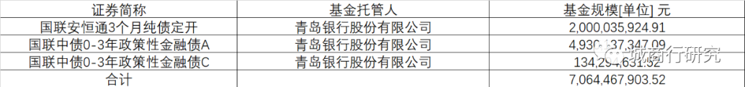 11月30日,由青岛银行担任资产托管人的国联安基金-“国联安恒通3个月定开债券型证券投资基金”和国联基金-“国联中债0-3年政金债指数证券投资基金”同步落地,两只基金合计募集金额达70.6亿元,比苏州银行略胜一筹。