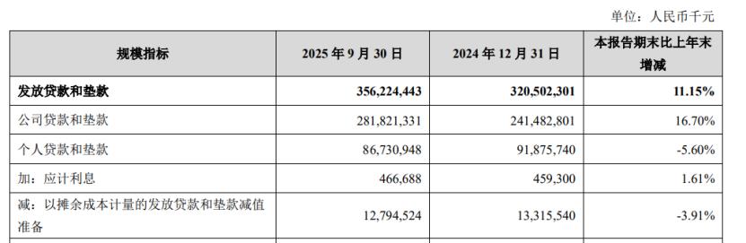 截至2025年前三季度,苏州银行发放贷款和垫款3562.24亿元,较年初增加11.15%。其中,公司贷款和垫款2818.2亿元,较上年末增长16.7%,个人贷款和垫款867.3亿元,较上年末减少了5.6%。