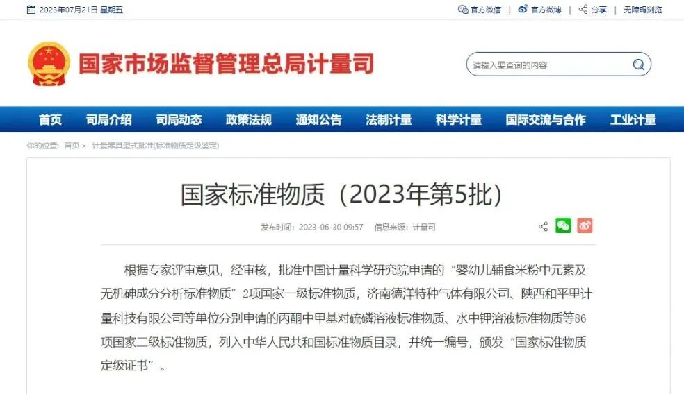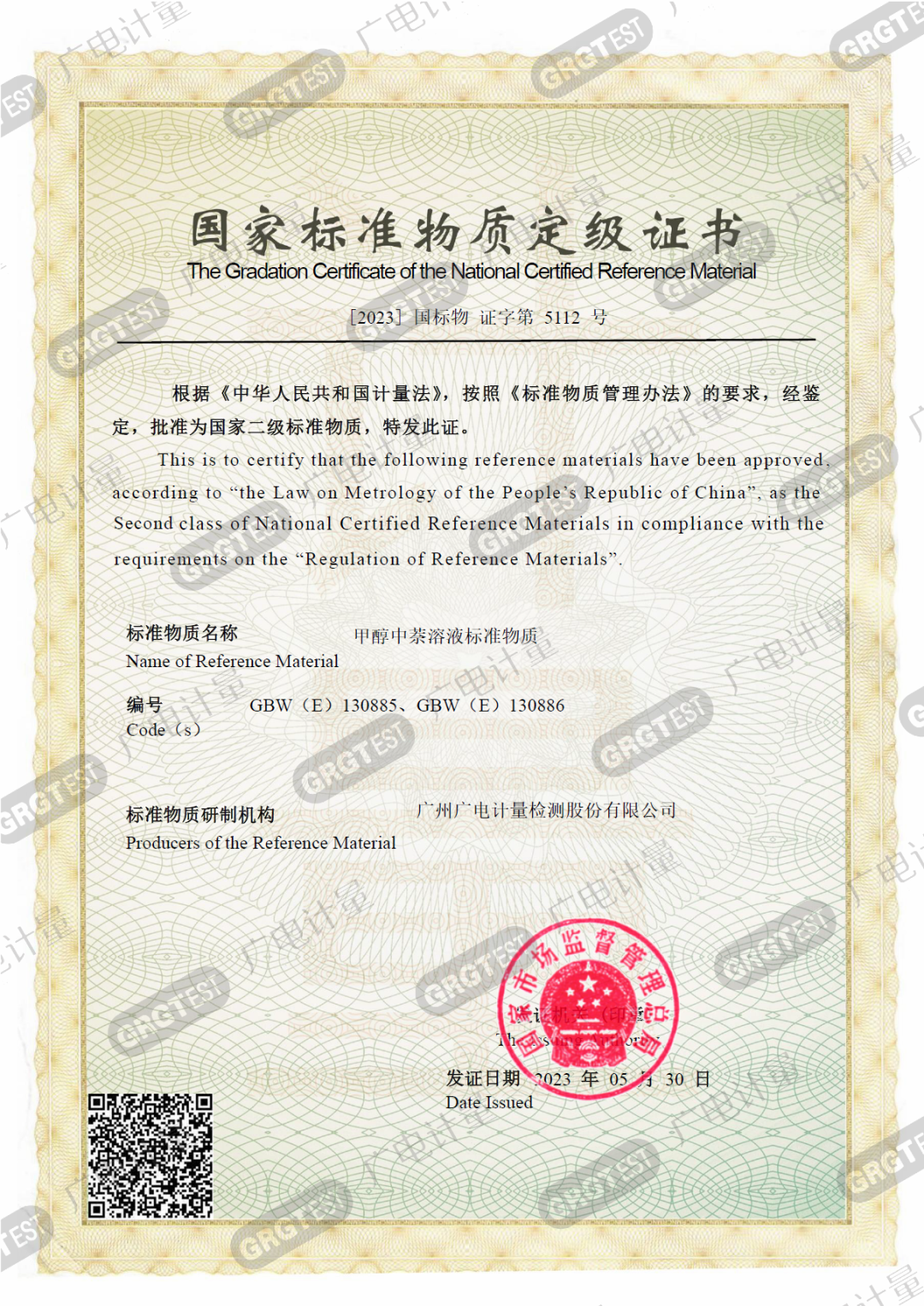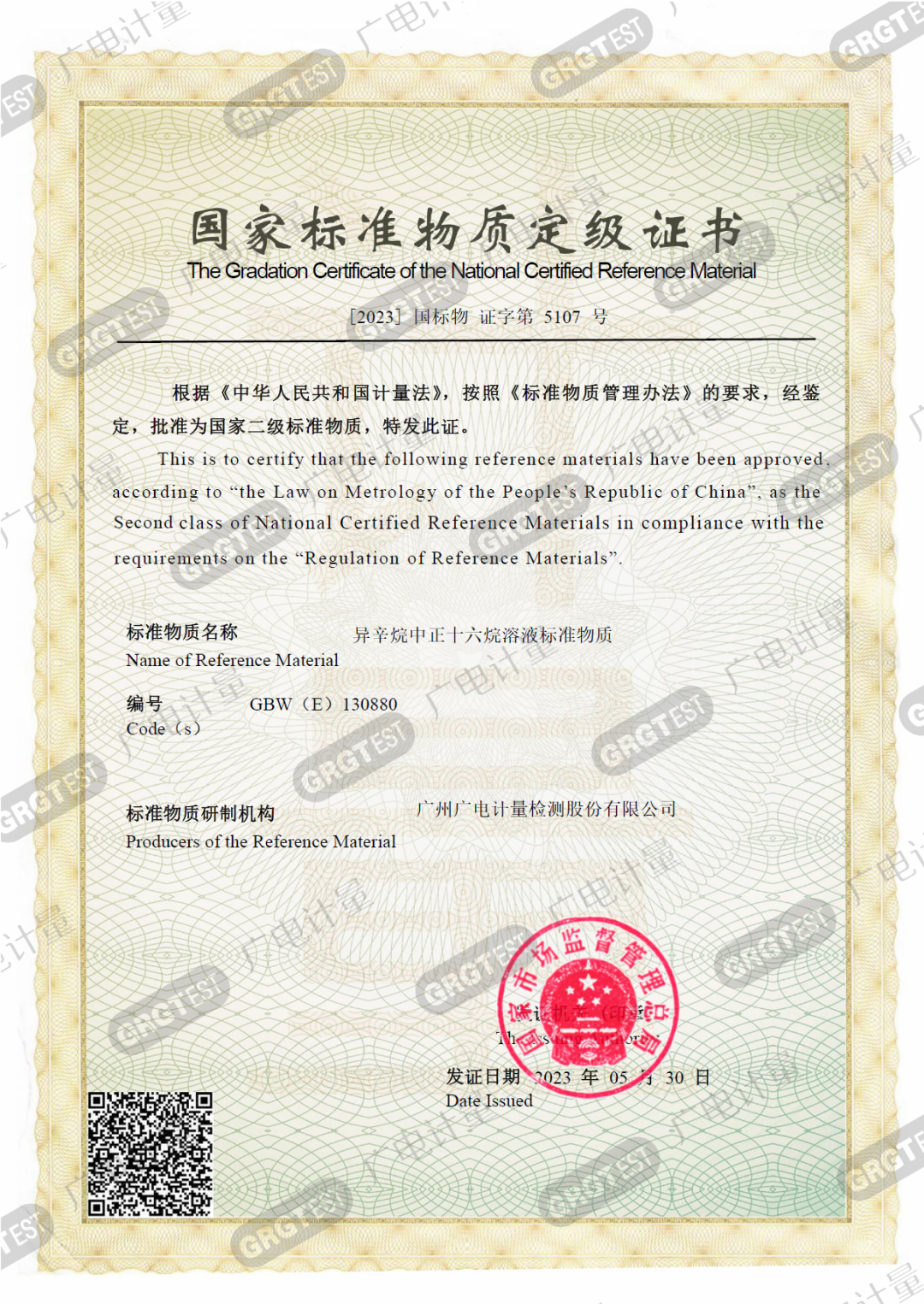 近日,国家市场监督管理总局公布了2023年第五批国家标准物质。广州无线电集团成员企业广电计量(SZ 002967)标准物质事业部研制的“异辛烷中正十六烷溶液标准物质”“异辛烷中硬脂酸甲酯溶液标准物质”“异辛烷中丙体六六六溶液标准物质”等8种标准物质获颁国家二级标准物质定级证书。