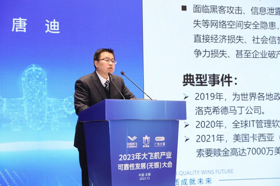 广电计量总经理助理、技术研究院副院长赵可沦,广电计量信息化服务事业部副总经理唐迪也受邀参与本次大会,围绕可靠性寿命指标验证、航空供应链网络安全等话题,分别作主题为《多失效竞争场合加速试验及其可靠性寿命指标验证评估方法》《航空供应链网络安全及应对措施建议》的分享。