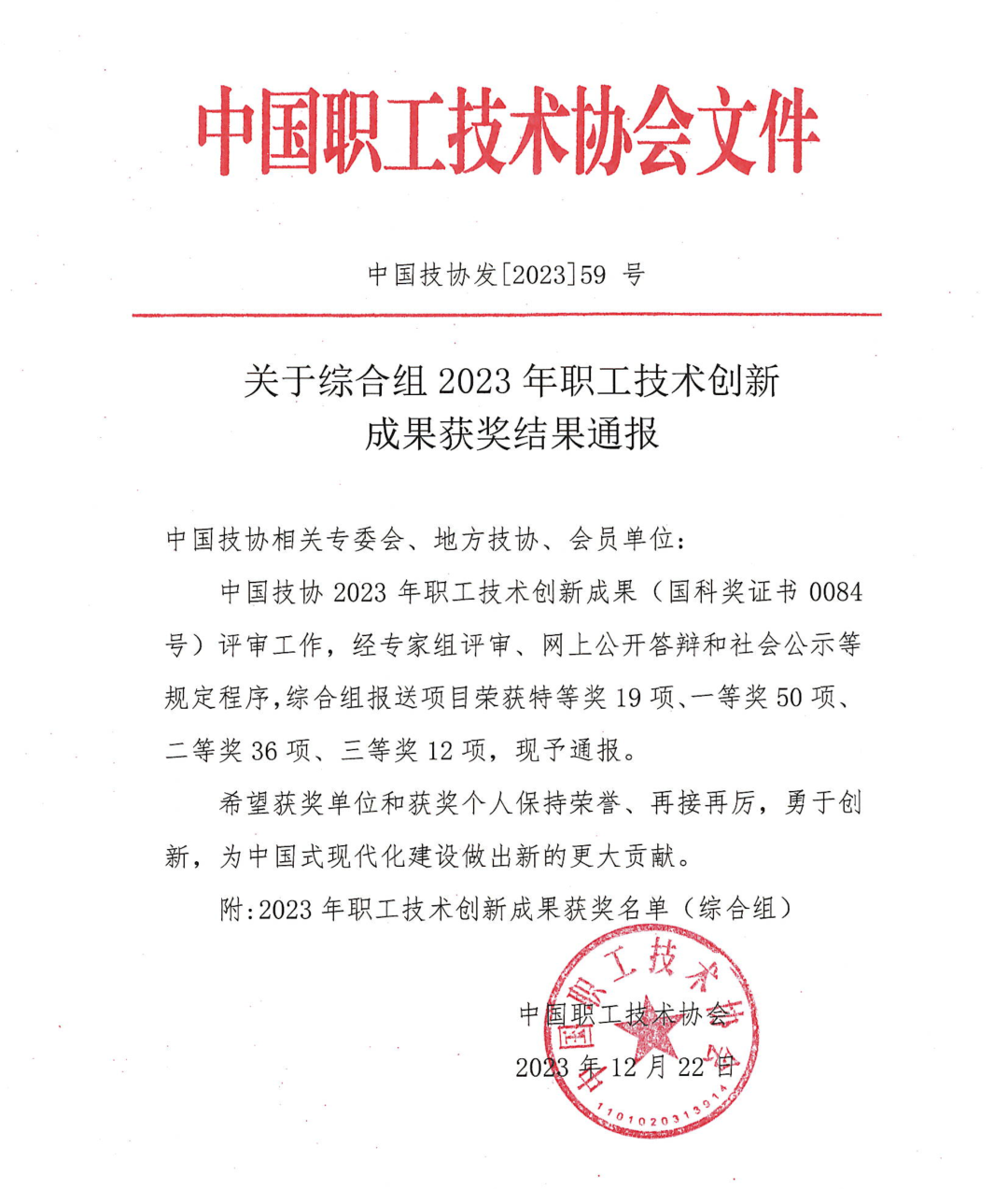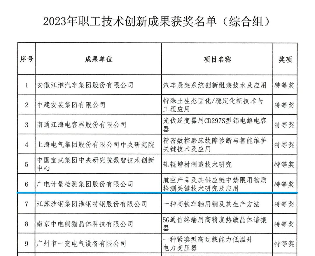 12月22日,中国职工技术协会发文公布2023年职工技术创新成果获奖结果。由广电计量申报、广州市总工会推荐的《航空产品及其供应链中禁限用物质检测关键技术研究及应用》荣获全国特等奖。