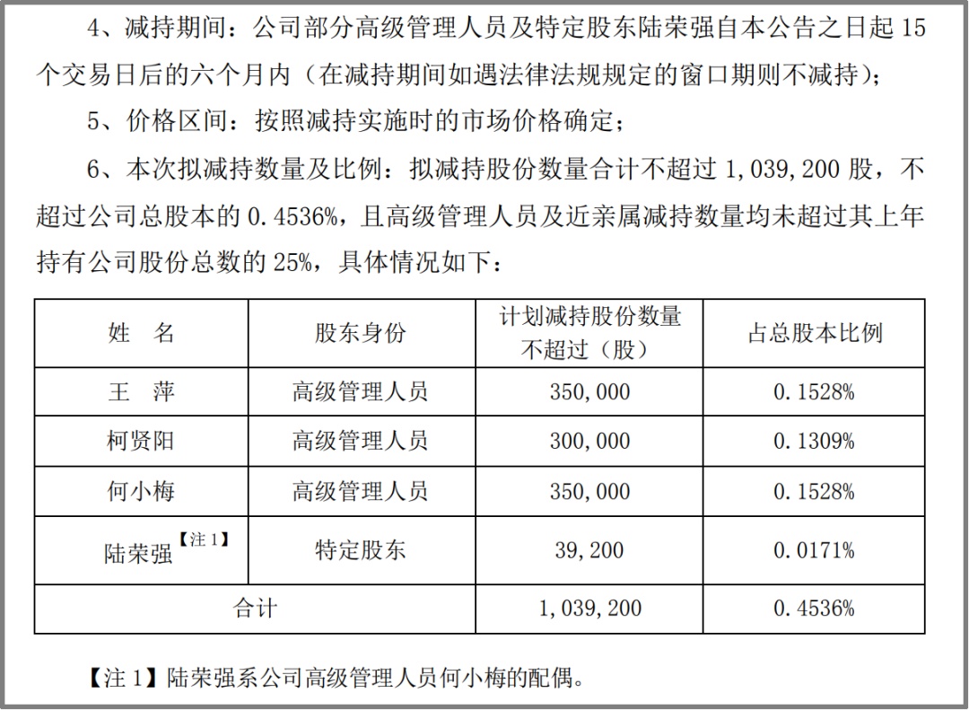 3位高管及1位特定股东自公告之日起15个交易日后的六个月内计划以大宗交易或集中竞价方式减持股份数量合计不超过103.92万股,不超过新大正总股本的0.4536%。