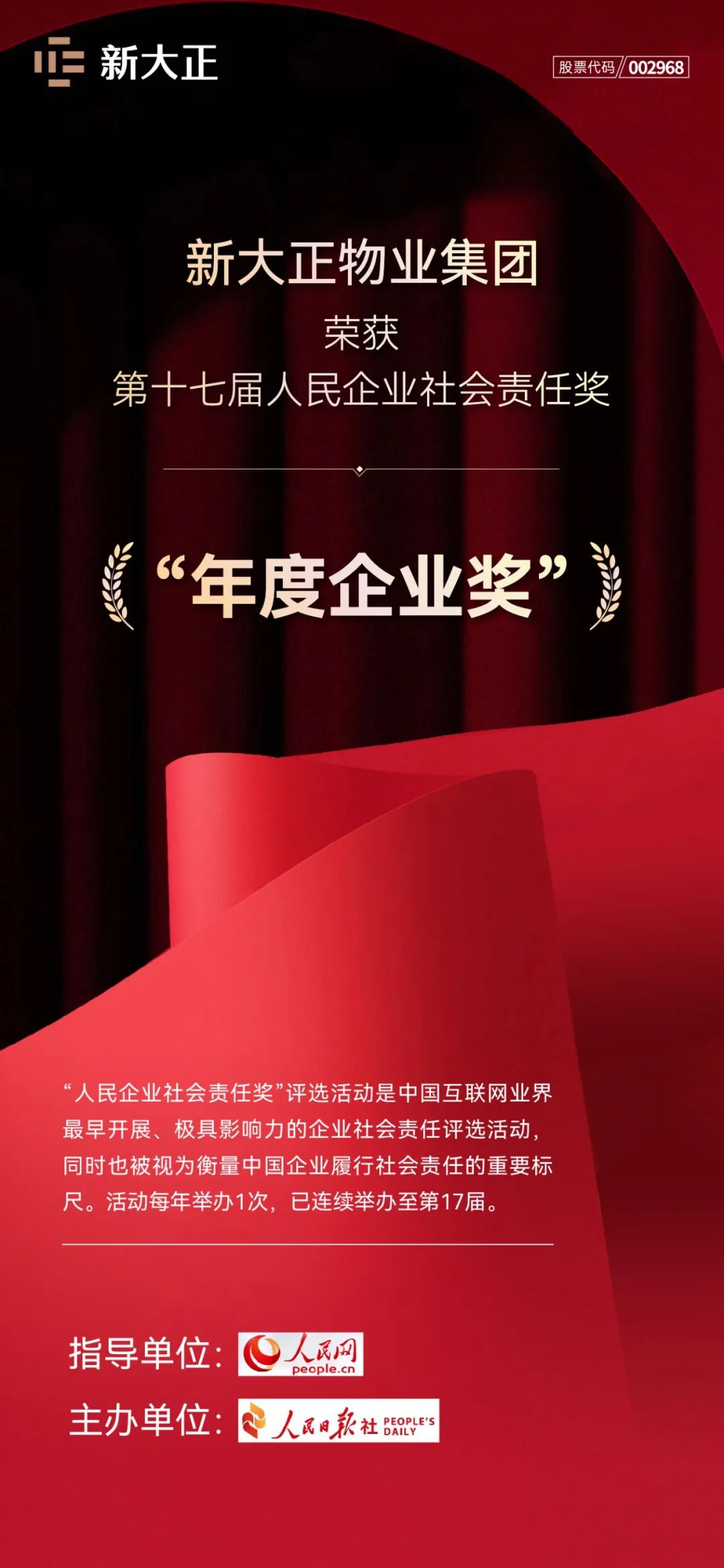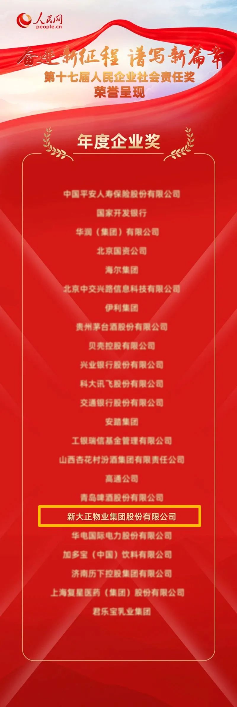 为见证2022年企业在社会责任领域取得的成绩与收获,12月24日,人民网在人民日报社指导下举办“奋进新征程谱写新篇章——2022人民企业社会责任高峰论坛”。论坛分为“绿色答卷”、“筑梦乡间”、“基业长青”、“星河万里”四个篇章,邀请政府部门、行业企业、社会组织、研究机构等各界嘉宾,围绕企业社会责任展开交流,并对这一年在履行社会责任方面积极作为的企业进行表彰。新大正获评第十七届人民企业社会责任奖“年度企业奖”。