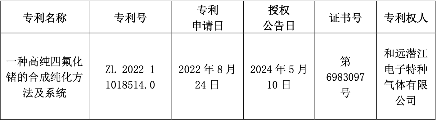 5月13日,和远气体发布公告称,近日,公司全资子公司和远潜江电子特种气体有限公司取得了1项发明专利,专利名称:一种高纯四氟化锗的合成纯化方法及系统。
