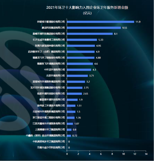据环卫科技网统计,截至2021年12月20日,环卫市场共释放158个亿元级环卫项目,开标项目总金额超757亿元,单个项目中标金额最高达61亿元。值得一提的是,侨银股份市场表现卓越,2021年中标总金额、年服务新增金额双双位居行业首位。两份榜单分别显示,公司年内共斩获15个环卫项目,总成交金额超178亿元;年服务新增金额11.9亿元,均位居榜首。