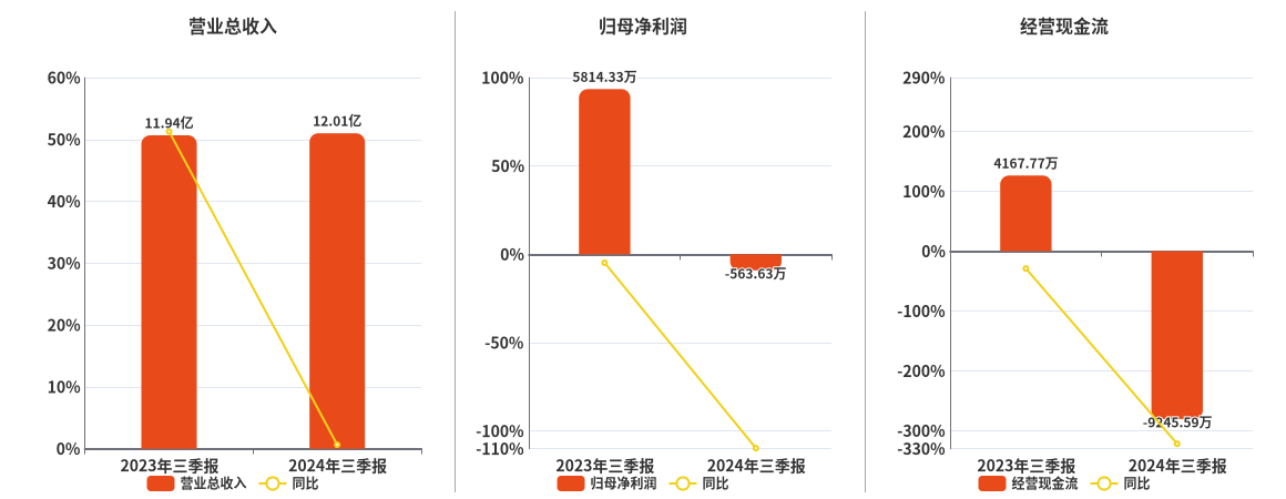 公司营业总收入为12.01亿元,在已披露的同业公司中排名第129,较去年同报告期营业总收入增加763.51万元,实现4年连续上涨,同比较去年同期上涨0.64%。归母净利润为-563.63万元,在已披露的同业公司中排名第212,较去年同报告期归母净利润减少6377.96万元,同比较去年同期下降109.69%。经营活动现金净流入为-9245.59万元,在已披露的同业公司中排名第221,较去年同报告期经营活动现金净流入减少1.34亿元,同比较去年同期下降321.84%。