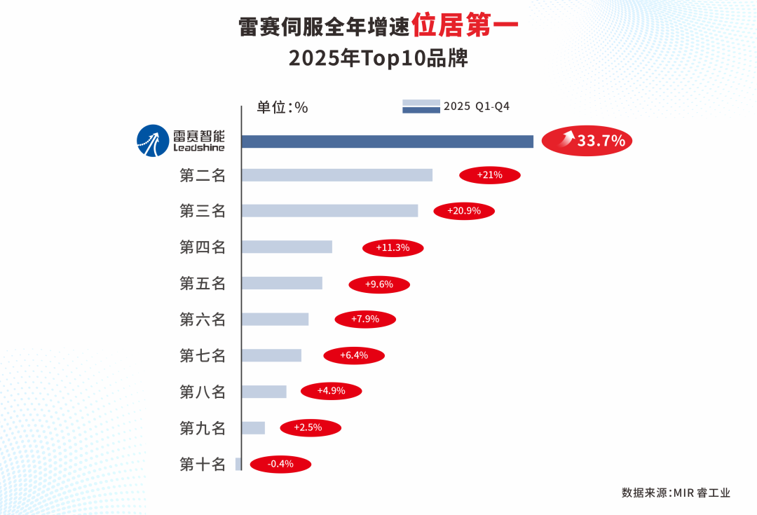 据行业权威研究机构MIR睿工业最新发布的数据报告显示,2025年雷赛智能(股票代码:002979)伺服增长率为33.7%,全国第一!行业TOP10品牌中,雷赛全年增速第一!