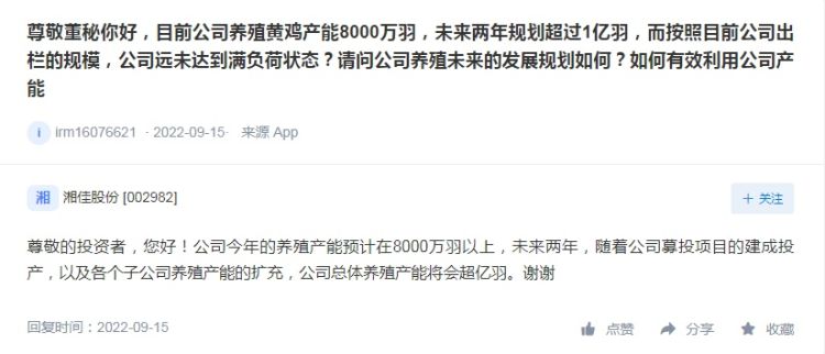 就产能问题,湘佳股份此前回答投资者提问时表示,公司今年的养殖产能预计在8000万羽以上,未来两年,随着公司募投项目的建成投产,以及各个子公司养殖产能的扩充,公司总体养殖产能将会超亿羽。