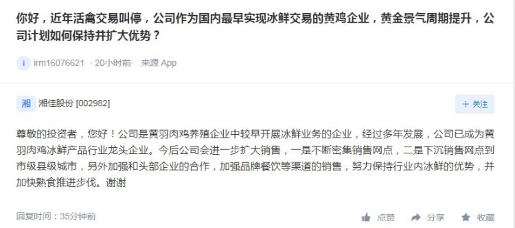 就投资者提问,湘佳股份10月13日在深交所互动易平台表示,公司是黄羽肉鸡养殖企业中较早开展冰鲜业务的企业,经过多年发展,公司已成为黄羽肉鸡冰鲜产品行业龙头企业。今后公司会进一步扩大销售,一是不断密集销售网点,二是下沉销售网点到市级县级城市,另外加强和头部企业的合作,加强品牌餐饮等渠道的销售,努力保持行业内冰鲜的优势,并加快熟食推进步伐。