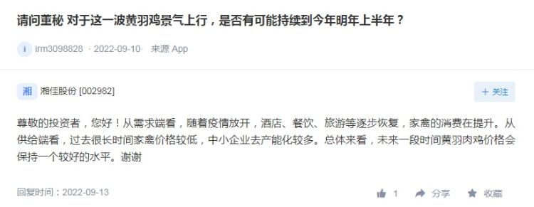 就黄羽肉鸡景气度问题,湘佳股份此前回答投资者提问时表示,从需求端看,随着疫情放开,酒店、餐饮、旅游等逐步恢复,家禽的消费在提升。从供给端看,过去很长时间家禽价格较低,中小企业去产能化较多。总体来看,未来一段时间黄羽肉鸡价格会保持一个较好的水平。