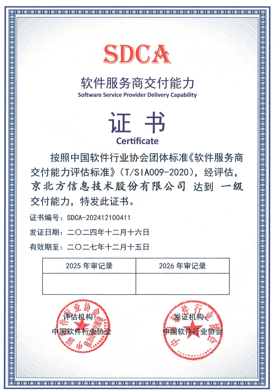 近日,京北方顺利通过中国软件行业协会SDCA软件服务商交付能力一级评估。该评估分为四级,一级为最高级别。此次评估标志着京北方的软件交付能力在业内继续保持最高水平,在技术创新、大型项目交付等方面具有显著优势。