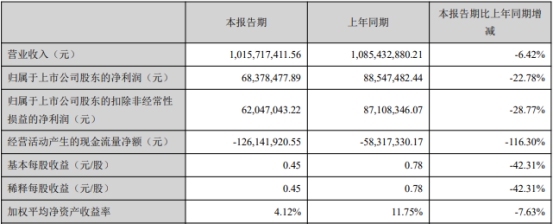 今年上半年,中天精装实现营业收入10.16亿元,同比减少6.42%;实现归属于上市公司股东的净利润6837.85万元,同比减少22.78%;实现归属于上市公司股东的扣除非经常性损益的净利润6204.70万元,同比减少28.77%;经营活动产生的现金流量净额为-1.26亿元,同比减少116.30%。