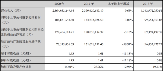2020年,中天精装实现营业收入25.65亿元,同比增长9.63%;实现归属于上市公司股东的净利润1.89亿元,同比增长3.05%;实现归属于上市公司股东的扣除非经常性损益的净利润1.72亿元,同比减少3.16%;经营活动产生的现金流量净额为7051.90万元,同比减少58.91%。