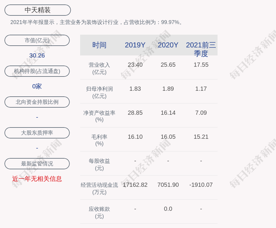 2021年半年报显示,中天精装的主营业务为装饰设计行业,占营收比例为:99.97%。