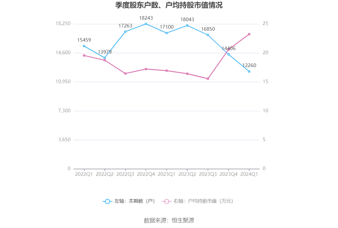 筹码集中度方面,截至2024年一季度末,公司股东总户数为1.23万户,较上年末下降了2146户,降幅14.90%;户均持股市值由上年末的20.58万元上升至23.22万元,增幅为12.83%。