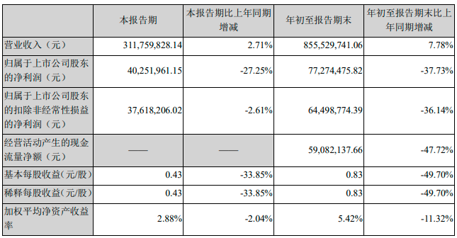 10月26日,甘源食品(SZ002991)公告,第三季度营业收入约3.12亿元,比上年同期增长2.71%,归属于上市公司股东的净利润约4025.2万元,比上年同期减少27.25%,归属于上市公司股东的扣除非经常性损益的净利润约3761.82万元,比上年同期减少2.61%,基本每股收益0.43元/股,比上年同期减少33.85%,总资产约16.84亿元,比上年同期减少4.36%。