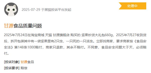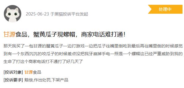 在黑猫投诉平台上,关于甘源食品的投诉量多达240条,内容涉及食品变质、有异物、虚假宣传等,诸多消费者曾在其产品中发现铁钉、螺丝钉、虫子、石块等异物,严重威胁消费者健康。这些食品安全问题严重损害了公司的品牌形象,降低了消费者对品牌的信任度。