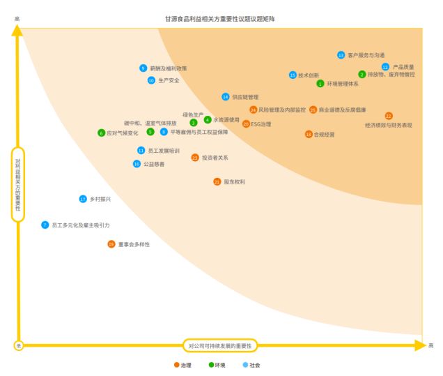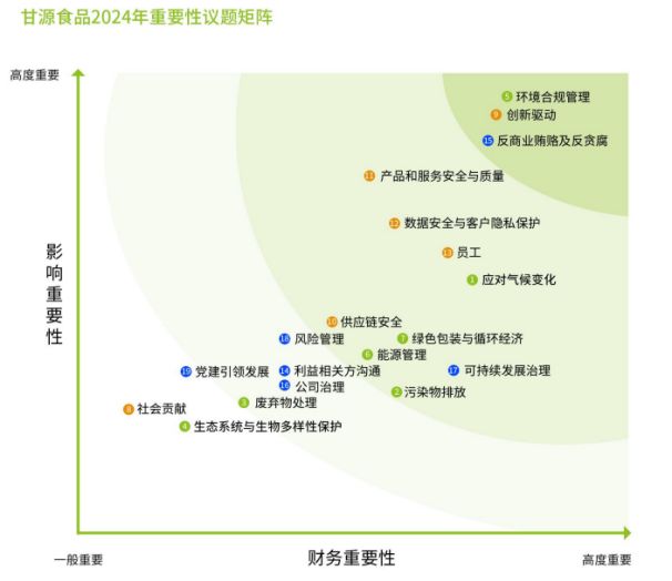 此外,就企业重要性议题矩阵而言,重要性议题的变化直观反映了甘源食品对企业可持续发展的重视。在甘源食品2023年度ESG报告中,“客户服务与沟通”和“产品质量”两个议题是重要性最高的,而在2024年社会责任报告的重要性议题矩阵中,“环境合规管理”这一议题是19个企业议题中优先级别最高的。