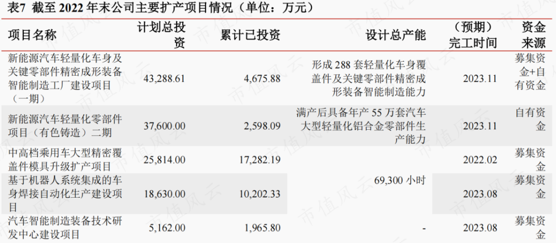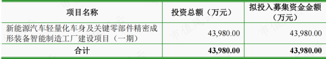 2022年的可转债募投项目—新能源汽车轻量化车身及关键零部件精密成形装备智能制造工厂建设项目(一期),总投资为4.4亿元。