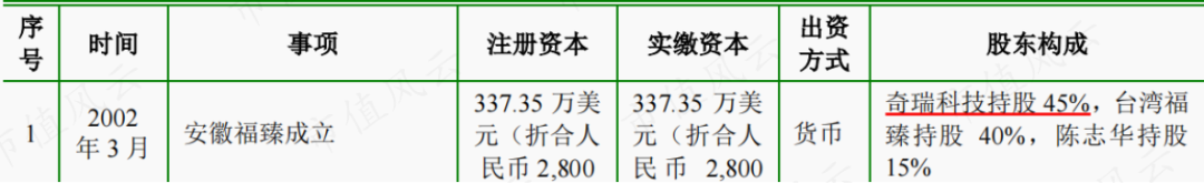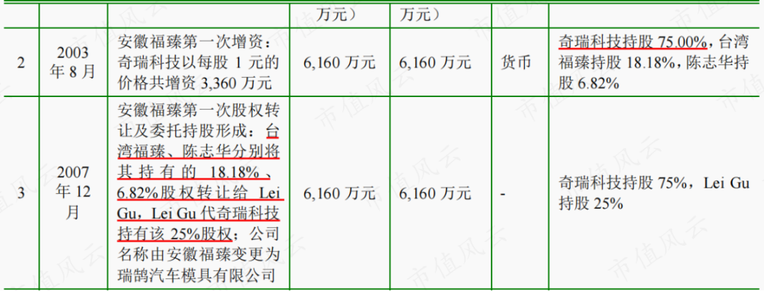 2007年,台湾福臻和陈志华分别将其持有的公司股份转让给 Lei Gu,Lei Gu 代奇瑞科技持有该25%股权,此时奇瑞科技实质上持有公司100%股权。