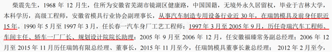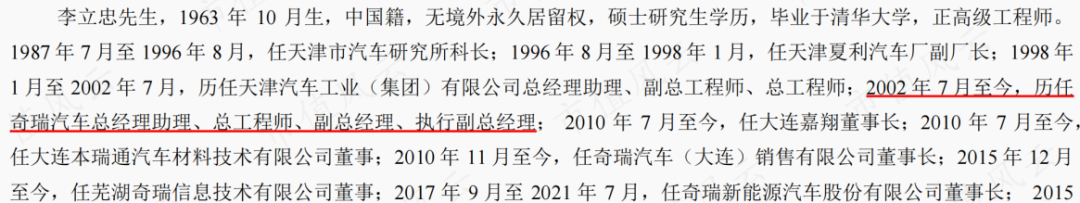 柴震此前也在奇瑞汽车任职,董事李立忠目前为奇瑞汽车执行副总经理。
