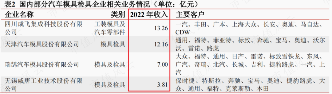 我国汽车模具行业集中度较低,业内上市公司主要为成飞集成(002190.SZ)、天汽模(002510.SZ)和威唐工业(300707.SZ)等,公司与成飞集成等同行在规模上还存在一定差距。