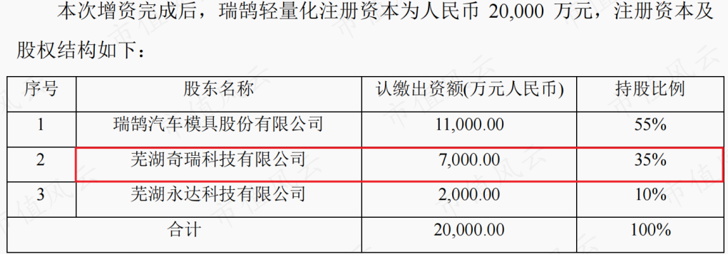 2023年3月,公司和奇瑞科技分别对瑞鹄轻量化进行增资,以投资建设新能源汽车轻量化零部件项目(二期)。