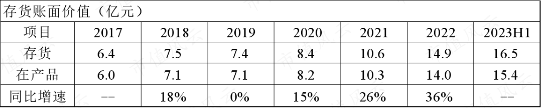 存货中在产品金额的变化情况也能一定程度反映未来的业绩,2022年末,在产品账面价值为14亿元,同比增速也较高。