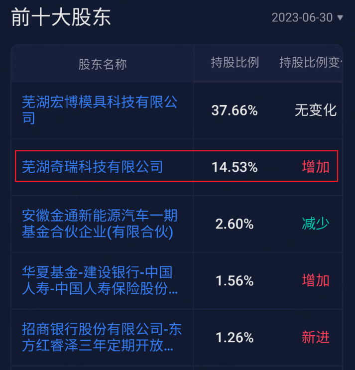 截至2023年6月30日,奇瑞科技持股比例为14.53%,是公司第二大股东。