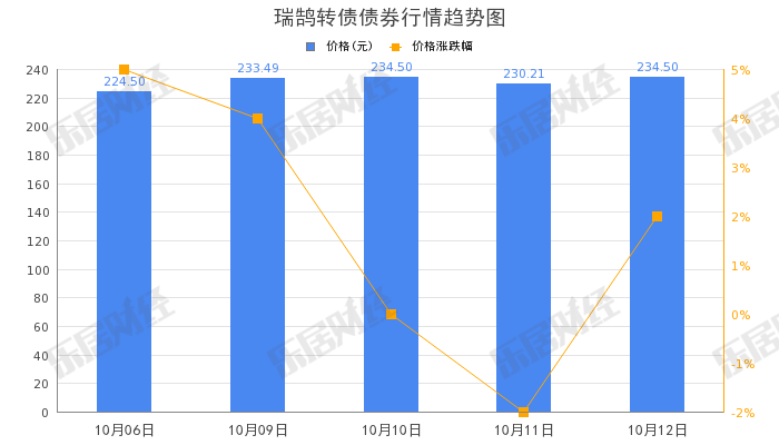 10月13日,“瑞鹄转债”(127065)早盘拉高,截至11:10,涨幅10.4%,报258.88元。总成交量78.35万手,成交额19.67亿元。