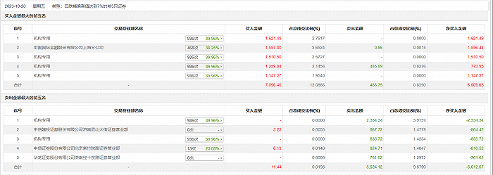 10月20日,瑞鹄模具今日跌停,全天换手率达7.35%,振幅达9.64%。龙虎榜数据显示,营业部席位合计净买入996.98万元。其中,机构买入5539.1万元,卖出3655.95万元,合计净买入1883.15万元。此外,中信建投证券济南双山大街证券营业部、中信证券北京紫竹院路证券营业部分别卖出867.72万元、824.71万元;中国国际金融上海分公司、中信证券北京紫竹院路证券营业部分别买入1557.30万元、8.19万元。
