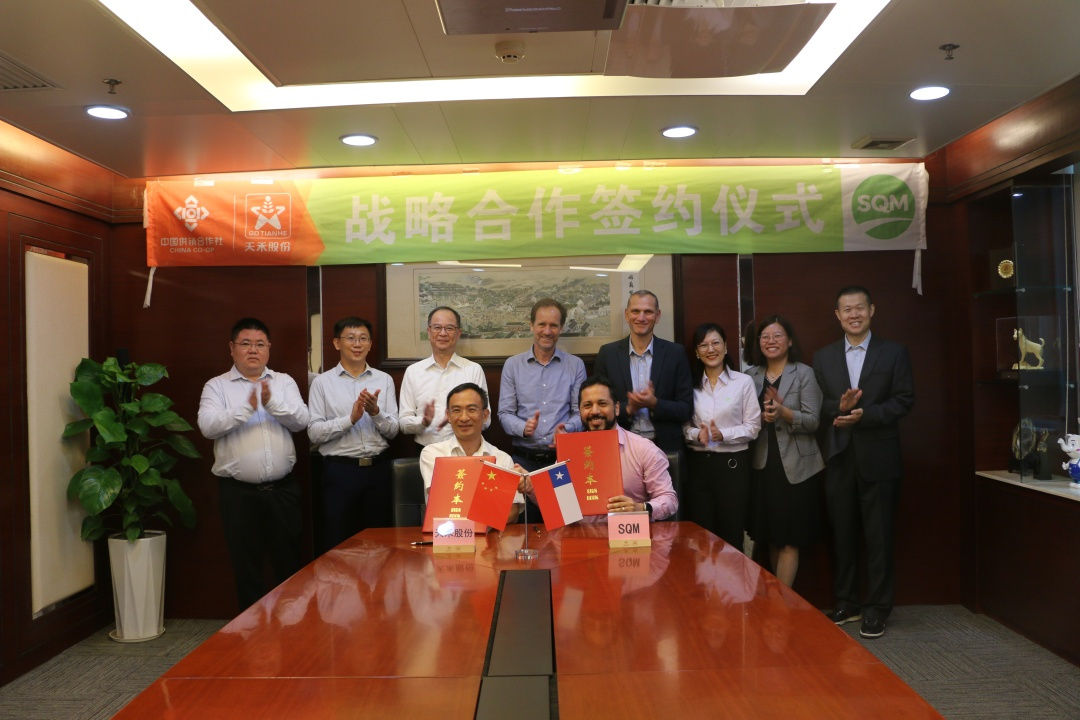 10月20日,广东天禾农资股份有限公司(下称天禾股份)与智利化学矿业有限公司(下称SQM)在天禾股份本部大楼签订了战略合作协议。SQM全球商务副总裁Christian Luders、全球供应链总监Marc Goetschalckx、亚太商务总监Victor Larrondo、中国区销售负责人李升瑞,天禾股份董事长刘艺、副总经理罗旋彬、特种肥料部总经理于卫东等共同参加了签约仪式。