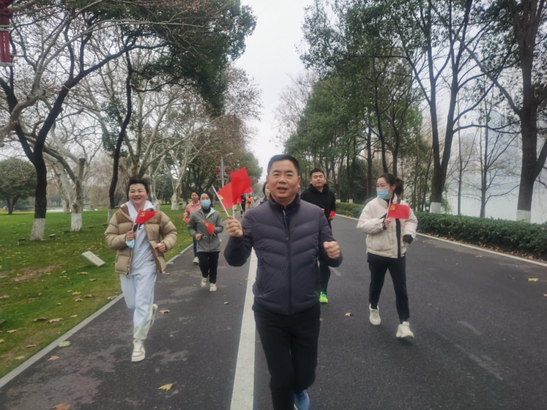 这一天,虽然寒风凛冽,但吹不散同志们高昂的热情。伴着早春梅花的清香,同志们手持小党旗、小国旗,从橘子洲入口一路跑步到毛主席雕像,瞻仰伟人风采。