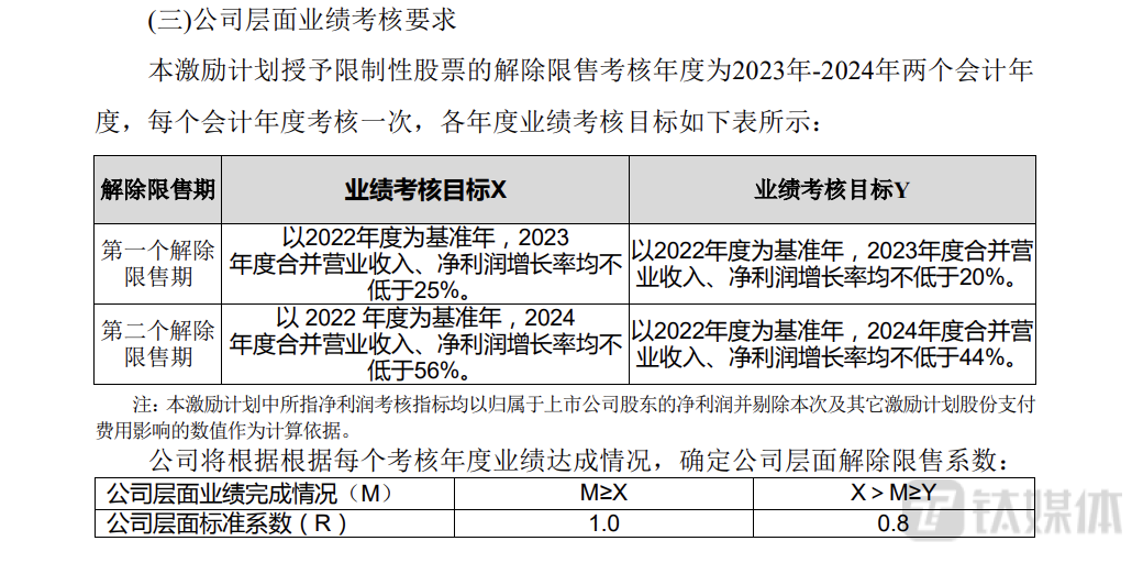 第二个解禁期的考核目标同样是以2022年度为基准年,要求2024年的营业收入和净利润增长率都不低于56%,即2024年实际收入不低于22.81亿元,利润不低于1.95亿元,则解锁100%;若收入和利润增长不低于44%,即收入不低于21.05亿元、利润不低于1.8亿元,则解锁80%。