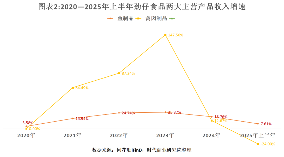尽管如此,今年上半年劲仔食品的鱼制品收入增速已明显放缓。今年上半年,其鱼制品收入为7.57亿元,同比增长7.61%,跟此前的增速相比有所放缓。数据显示,2021—2024年,劲仔食品鱼制品收入同比增速分别为15.94%、24.74%、25.87%、18.76%。