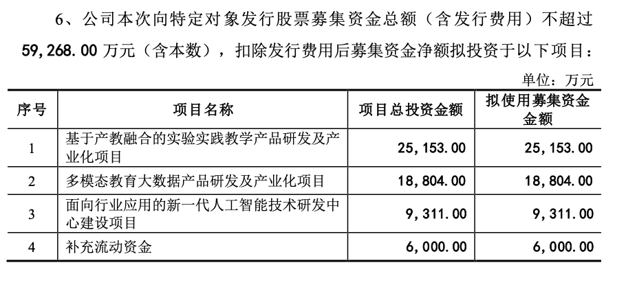 另外,今年7月10日,竞业达发布《2023年度向特定对象发行A股股票募集说明书》,随后历经三次修改,于10月30日发布了募集说明书的三次修订稿。最新版本说明书显示,此次公司向特定对象发行股票募集资金总额(含发行费用)不超过5.93亿元,与申报稿版本的7.91亿元相比有所下降。募资金额拟投资用于基于产教融合的实验实践教学产品研发及产业化项目、多模态教育大数据产品研发及产业化项目、面向行业应用的新一代人工智能技术研发中心建设项目和补充流动资金。