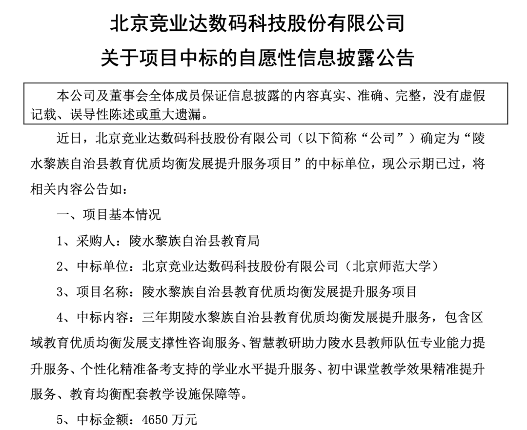 公告中,竞业达称,该项目属于公司核心业务中智慧教学与校园业务,围绕推动区域迈入教育优质均衡发展的核心目标,发挥公司教育服务资源整合能力,提供规划咨询、优质教育资源引进、助力教师队伍建设等整体方案服务。该项目体现了国家加快义务教育优质均衡发展大背景下,公司在基础教育市场的竞争力,对公司未来经营业绩产生良好的促进作用。