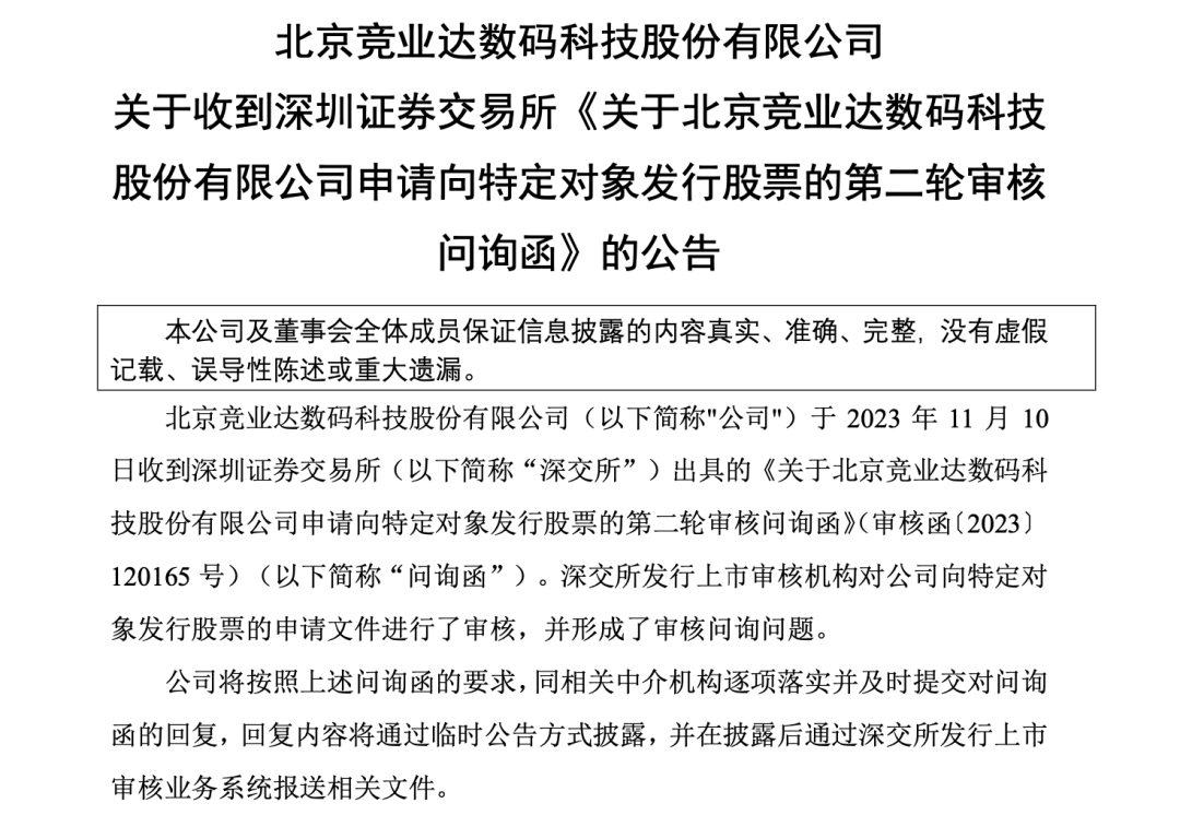 对此,11月10日,深交所下发《关于北京竞业达数码科技股份有限公司申请向特定对象发行股票的第二轮审核问询函》,要求竞业达进一步说明各募投项目的效益测算是否谨慎、合理,并补充说明公司及其控股、参股公司、本次募投项目是否涉及教育业务,是否存在学科教育等规范类教育业务,是否符合“双减”政策要求等问题。此前,竞业达曾于7月21日收到深交所关于定增的问询函,并在8月31日给出回复。
