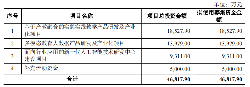 募投项目使用募资的具体金额也做出了对应调整。募集资金在扣除发行费用后将用于产教融合的实验实践教学产品研发及产业化项目、多模态教育大数据产品研发及产业化项目、面向行业应用的新一代人工智能技术研发中心建设项目以及补充流动资金。其中产教融合的实验实践教学产品研发及产业化项目占本次募集资金的39.57%。