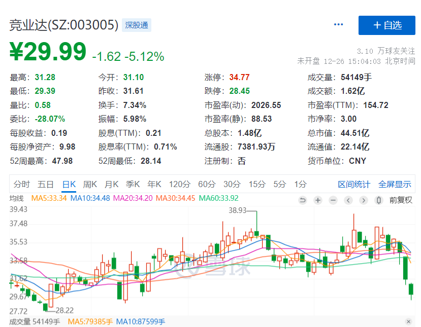 此次定增公告发布前后,竞业达股价接连下挫,截至12月26日收盘,其股价报收29.99元,跌幅为5.12%。目前已经连续三个交易日下滑,累计下滑超17%。