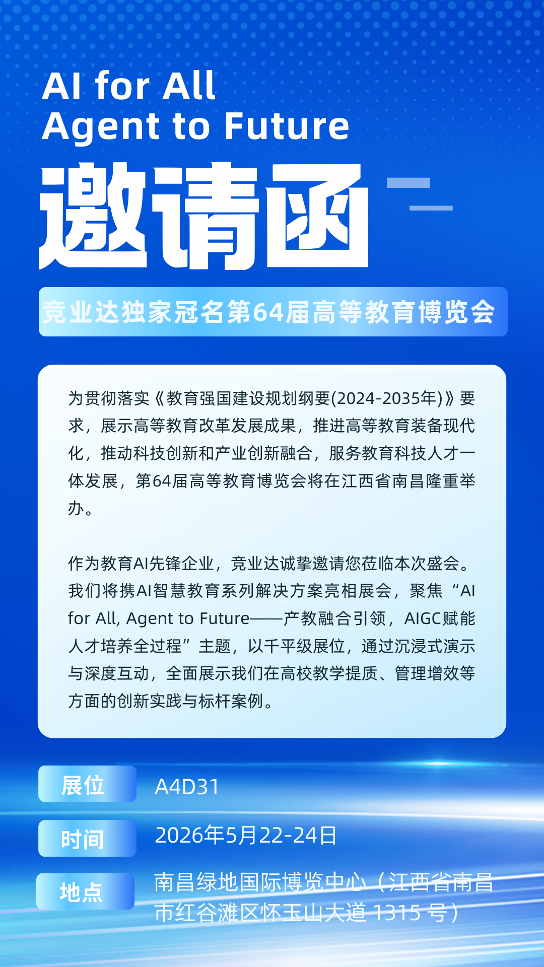 2026年是AI教育赋能高等教育高质量发展的攻坚之年,更是产教融合、科教融汇向纵深推进的关键之年。立足行业前沿,竞业达以独家冠名第64届高博会之姿,持续彰显在教育AI领域的标杆引领实力,推动人工智能技术与高等教育深度融合、协同创新,共绘高等教育高质量发展新篇。