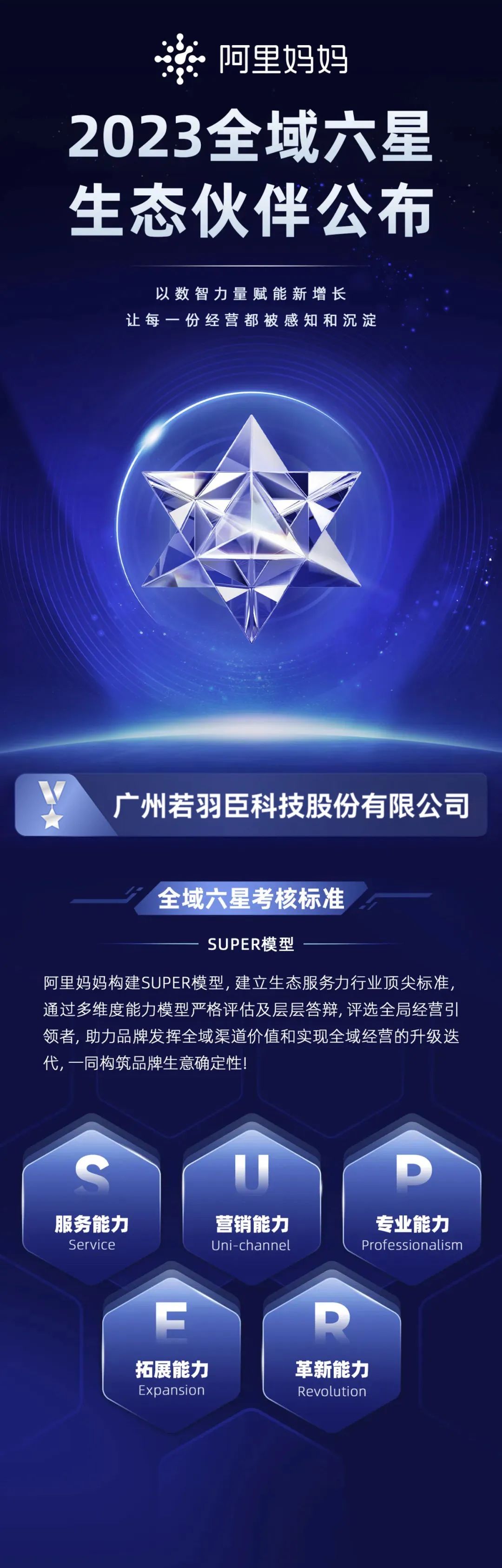 经过多维评估及层层角逐,2023年度阿里妈妈「全域六星生态伙伴」认证名单正式出炉,若羽臣凭借全局洞察能力、布局能力和数智能力构建全域经营力,以强有力的交付能力,再次突出重围,斩获认证资质。
